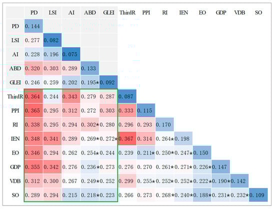 Most studies have proposed countermeasures based on socio-economic factors to control urban shrinkage. In the face of China’s changing economy, there is tremendous pressure on economic and administrative resources available to the government and society. As a result, there is an urgency to improve the effectiveness of shrinkage management in other ways. Based on the above results, this study found that urban form has an incredible influence on managing urban shrinkage. Naturally, one can ask whether its coupling with socio-economic factors can further explain the causes of urban shrinkage. Therefore, this study explored the influence of urban form and socio-economic factors on urban shrinkage using interaction detection in Geodetector. The results are shown in Figure 7. The influence of the pairwise interaction of 13 factors was found to be greater than that of a single factor, indicating that multiple factors drive urban shrinkage.
