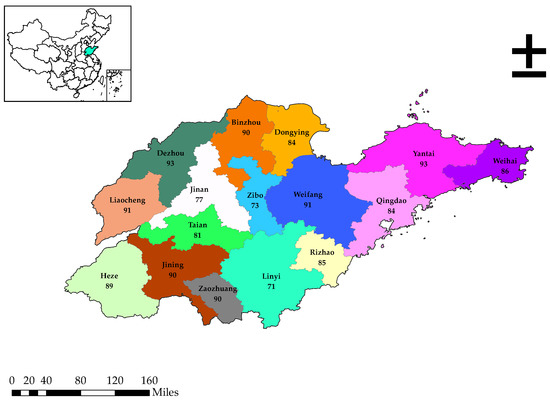 In 2019, the research group conducted a questionnaire survey for 16 prefecture-level cities in Shandong. The contents of the questionnaire mainly include the basic personal information of household members, family economic conditions, production factors, social relations, etc. This article conducts empirical analysis for the micro data obtained from the survey. The objects of investigation include 48 county-level cities in 16 prefecture-level administrative regions of Shandong. A total of 100 farmer households were investigated in each prefecture-level administrative region. In accordance with the village construction standard in the new era, the research group selected 1 demonstration village, 1 advanced village and 1 general village with respective questionnaire distribution quantities of 30, 30 and 40 to guarantee the balance and comprehensiveness of the sample distribution. A total of 1600 questionnaires were distributed and collected in this survey. Data related to this paper mainly include whether households transfer land, including transfer-in and transfer-out land; the area of land transfer; the income of households; the labor force size; the capital input, the age of the household head; the education level of the household head, the transportation convenience of cultivated land; and village infrastructure. We obtained 1368 valid samples after eliminating questionnaires from households who do not participate in agricultural production, households failing to have any major variables and households with untruthful data before the empirical analysis. Table 1 and Figure 1 show the geographical distribution of the samples.