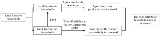 As shown in Figure 2, on the one hand, farmers with a relatively higher agricultural labor productivity are willing to transfer-in land to expand the scale of agriculture. The expansion of the agricultural production scale changes the agricultural production mode, which leads to the effects of scale economies and improves the agricultural labor production efficiency of farmer households. On the other hand, households with a relatively low agricultural labor productivity are willing to transfer-out land and release part of the labor force from the agricultural sector to the non-agricultural sector [50]. The development of the labor force in the non-agricultural sector improves their skills and non-agricultural labor productivity. Finally, the aggregate labor productivity of farmers’ families participating in the land is improved.