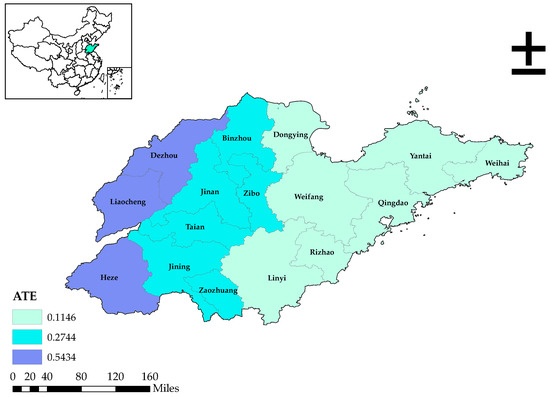 Because of the different geographical locations among cities, farmers’ resources and economic conditions vary greatly. It is important to discuss the impact of land transfer on farmers’ labor productivity in different regions to analyze the influence of regional heterogeneity on the research content. According to the administrative division, Shandong Province is divided into the eastern region, central region and western region. This paper respectively analyzes the ATE of the three regions with the sample data. Table 7 shows the regression results obtained by model II. Figure 3 shows the distribution of ATE among different regions in Shandong Province, which means the impact of land transfer on the labor productivity of rural households. The eastern regions include Qingdao, Yantai, Weihai, Rizhao, Weifang, Linyi and Dongying. The central regions are Jinan, Zibo, Tai’an, Binzhou, Jining and Zaozhuang. The western regions are Liaocheng, Heze and Dezhou. The effect of land transfer on labor productivity varies greatly among different regions. The coefficient in the eastern Shandong is the smallest and not significant, which is related to the relatively developed economic conditions in the eastern region. The cities in eastern Shandong are mostly coastal cities where port transportation and diversified industrial development provide more employment opportunities for farmers. Therefore, the skills and age are more important for farmers to improve labor efficiency in eastern Shandong. The regression coefficient of western Shandong Province is the largest and meets the significance level of 1%. The western regions mainly include Liaocheng, Heze and Dezhou, where the economic conditions are relatively backward, where the labor is restricted by economic development and stays in rural areas. Thus, land transfer is an important way to improve labor productivity. The overall labor force level of farmer households in western Shandong can be increased by 72.19% (e^0.5434-1) through transferring land. The dependence on land of farmers in the central region is lower than that in the western region, but land transfer can also significantly improve their productivity. Labor productivity will be increased by 31.57% (e^0.2744-1) after transferring land.