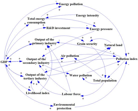 - Grain security→Total population→Air/Water pollution→Pollution index→Output of the tertiary/secondary industry→GDP→Output of the primary industry (a negative loop).