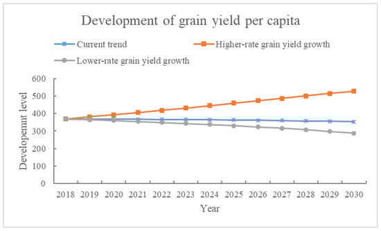 Similarly, the development of grain yield per capita sees the same development trends, as shown in Figure 5. Therefore, the higher-rate grain yield growth scenario that is set by this paper can protect cultivated land resources and ensure food security.