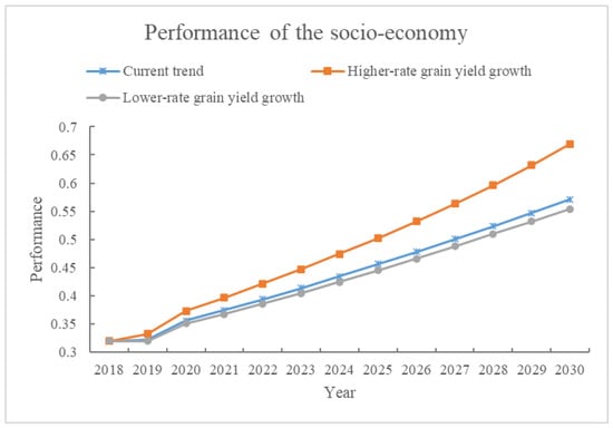 For the environment, the performance shows an opposite trend during 2018–2030, as shown in Figure 7. It will decrease sharply from 0.66 to 0.32 on the current development trend, and the situation under lower-rate grain yield growth will be even more serious. By comparison, the environmental performance can almost maintain the present level under higher-rate grain yield growth. The results imply that ensuring food security can also benefit environmental development, which can be explained through the indicators’ weights in Table 2. Grain yield per capita and cultivated land per capita contribute to 23.32% and 11.95% of environmental performance, respectively; this is one-third in total. Therefore, the environmental performance ranks are shown below: scenario under higher-rate grain yield growth > current scenario > scenario under lower-rate grain yield growth.