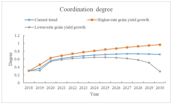 The coupling degrees under three scenarios are shown in Figure 8, reflecting the interacting intensity between the socio-economy and the environment. The trends under the current and higher-rate yield growth scenarios are similar, increasing from 0.2 to almost 1. In contrast, the coupling degree under lower-rate grain yield scenario growth sharply declines after 2027 to the original level.