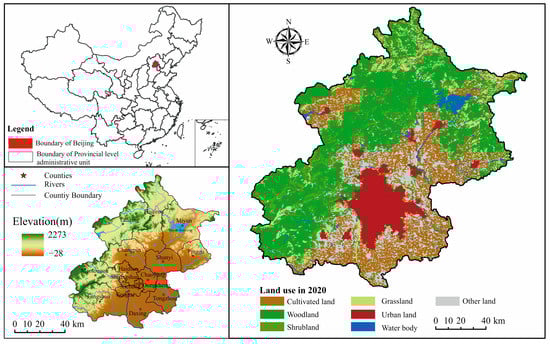 Beijing is the capital of China, with 16 districts covering an area of 16,410 km2 (Figure 1). The topography slopes from north to south, with an average elevation of 43.5 m. The terrain is mainly mountainous and hilly and is surrounded by mountains on three sides and plains to the east. The four different seasons occur in the typical temperate continental monsoon environment. In the last decade, there has been an average of 644 mm of precipitation and an 11 to 13 °C range in average yearly temperature. Beijing has witnessed rapid social and economic development, with its population expanding from 13.636 million in 2000 to 21.893 million in 2020.