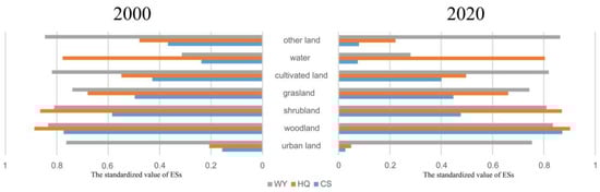 To facilitate comparison between years, ES were standardized from 0 to 1 (low to high). By comparing the average ES value changes among various land-use categories (Figure 2), CS and HQ of urban, other land, and water all showed a significant decrease, whereas WY did not change significantly. This finding indicated that CS-HQ may have a highly synergistic relationship. Regardless of land-use type, the WY value is always the highest (>0.77). Woodlands had the highest CS and HQ functions, and the average CS and HQ of woodlands increased from 0.77 and 0.89 in 2000 to 0.87 and 0.90 in 2020, respectively. Urban land has the lowest CS and HQ, and the average CS and HQ of urban land have a significant decreasing trend, with CS and HQ decreasing from 0.16 and 0.21 in 2000 to 0.03 and 0.05 in 2020. This result shows that different land uses reflect different natural functions, and it can help create a better understanding of ecological synergies and trade-offs by the examining ES priority for each land use.