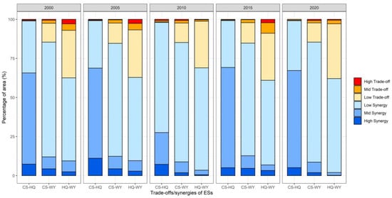 The ultimate goal of trade-off studies is to scientifically manage the trade-off relationships between ES. Areas with strong synergistic relationships serve as a spatial guide for areas that exhibit trade-offs or weak synergistic relationships and help promote the development relationships among ES. The GWR results revealed the spatial distribution of ES relationships in Beijing from 2000 to 2020 (Figure S3). The proportion of the ES synergies and trade-offs areas was then calculated (Figure 3). The CS-HQ pair showed synergistic relationships in most areas of Beijing from 2000 to 2020, with synergies accounting for 98.99% in 2000 and 99.13% in 2020. Strong synergistic areas gradually spread from Huairou District to the entire city, and most areas in Pinggu District, Yanqing County, and Fangshan District developed strong synergistic relationships by 2020. In contrast, a trade-off relationship occurred around the Miyun Reservoir, which is also a manifestation of the carbon sequestration capacity of water bodies, with 1.01% ES trade-offs areas in 2000 and 0.87% in 2020. There was a smaller CS-HQ trade-off in 2010 in the central urban and western regions, and the proportion of ES trade-offs areas was 1.13% more than that in 2020. The overall change in the CS-WY trade-offs and synergistic relationships in Beijing from 2000 to 2020 were not significant, and most ES correlations were concentrated in the low trade-off (12.07% in 2000 and 12.33% in 2020) and low synergy regions (73.42% in 2000 and 76.80% in 2020). This trade-off is mostly found on urban land in central Beijing. The region with a strong synergistic relationship in the surrounding area of Pinggu and Yanqing is decreasing, but the area with a strong trade-off relationship in Fangshan District is increasing. Most regions of the Beijing HQ-WY showed a trade-off relationship, with 62.55% in 2000 and 62.12% in 2020. The HQ-WY trade-off in Beijing is located roughly in the northwest, and a synergistic relationship is distributed in the southeast. Both strong synergistic and strong trade-off areas in the HQ-WY pairs declined between 2000 and 2020, decreasing from 2.87% to 0.53% in 2020, and from 2.44% to 0.18% in 2020 for strong trade-off and strong synergistic areas, respectively.