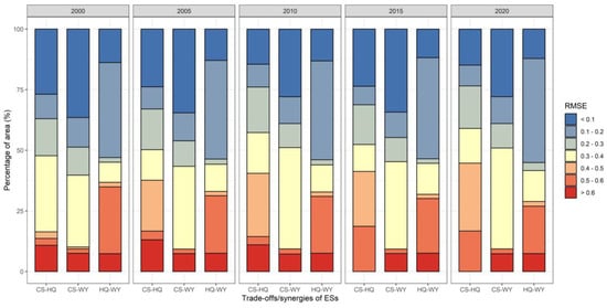 To further quantify the trade-offs strength among ES, locate high-value areas of trade-offs, and enable more target-oriented management, we conducted a trade-off degree analysis of the RMSE based on the above relationships (Figure S4), and counted the area proportion of each division (Figure 4). In 2000, the area with a higher RMSE (>0.4) for the CS-HQ pair continued to spread from Beijing’s major urban region, making up 16.38% of the entire area. The area with the highest RMSE (>0.6) around the main urban area tended to constantly grow and significantly decrease, with the percentage of areas with an RMSE greater than 0.6, ranging from 10.80% in 2000 to 0% in 2020. The RMSE of the CS-WY pair did not vary significantly in the study period, and locations with a high RMSE (>0.6) were primarily spread in Beijing’s central urban area and surrounding the Miyun Reservoir, accounting for 7.51% of the total area in 2000 and 7.33% in 2020. Moreover, the spatial patterns of RMSE for CS-HQ and HQ-WY perform identically. The RMSE of the HQ-WY pair showed no substantial spatial variance, and the RMSE stayed low (<0.3) in most areas, with a percentage of 54.92% in 2000 and 58.36% in 2020, except for the main urban area, which had high values (>0.5), accounting for 34.88% in 2000 and 26.94% in 2020.