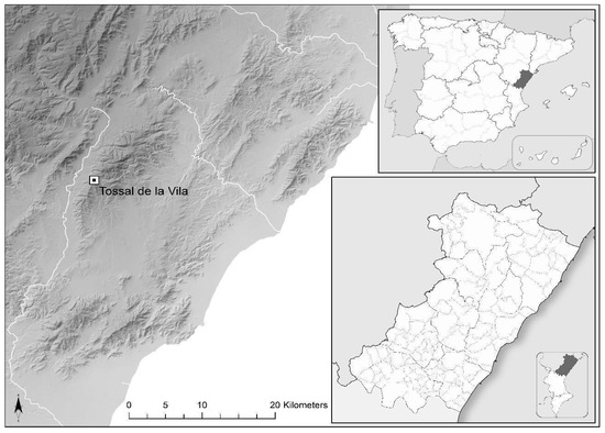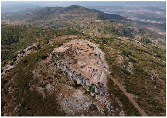 The Tossal de la Vila archaeological site is located on a wide rocky outcrop, on one of the highest peaks (954 m above sea level) in the south of the Serra d’En Galceran, a mountain range that delimits two of the main communication routes in the central area of the province of Castelló, Spain (Figure 1 and Figure 2). This gives rise to two very important natural corridors to the east and west of the mountain range, used by the many human communities that have inhabited the area since prehistoric times. To the west runs the Carbonera wadi, a tributary of the river Millars, which connect the route between the Mediterranean coastal area and the inland regions of El Maestrat. To the east is the corridor between Cabanes and Sant Mateu, a natural and traditional passage between the sub-region of La Plana de l’Arc, to the south, and the coastal plains formed by the rivers Cervol, Sénia and Ebre, to the north.