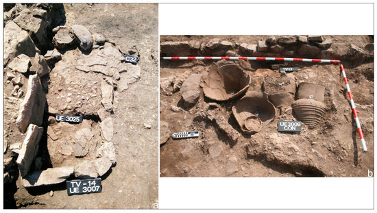 The entire central space of the settlement is free of buildings, with the exception of two free-standing structures, one described as a ‘privileged’ residence and the other as a mosque for communal use [5]. With regard to the different areas excavated protected by the wall, up to three different forms of modulation were identified. From the northern sector of the site to approximately half of the total length of the wall, a series of simple modules were identified, the basic residential units documented, each of which contained at least one hearth. The only multi-cellular building system discovered also shows a clear evolution from a simple module. Its development can be seen within different additions to the complex, which are not always orthogonal to the initial space and eventually form a clearly hierarchical space. We also identified a communal activity area attached to the complex with an independent entrance. The area had a raised oven built with slabs surrounded by various hearth structures, which we have identified as a small kitchen. Lastly, in the southern sector of the site, we identified a new simple module of completely different proportions and morphology to those of the residential modules. In this case, this was associated with various enclosures possibly made of perishable materials, which we believe to be a space for stables and storage (Figure 6).