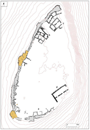 The easily accessible western front is defended with square or circular towers and bastions, together with a formidable wall with an average width of 3 m. The construction technique used consists of two solid dry-stone masonry walls, with the space between them filled with blocks and gravel (Figure 2). The layout was also conditioned by the intermittent nature of its function. Successive functions repeatedly repaired and modified the defensive structures, of which the intensity and functionality are still being analysed [3].