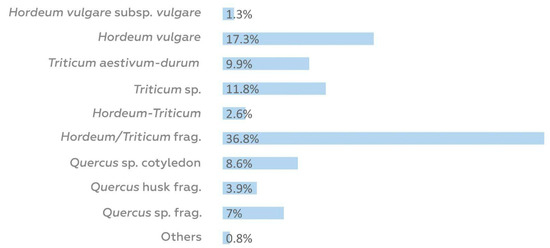 Protohistoric carpological record: relative frequency (%) of the carpological remains recovered. Data derived from Table A1 (Appendix A).