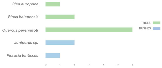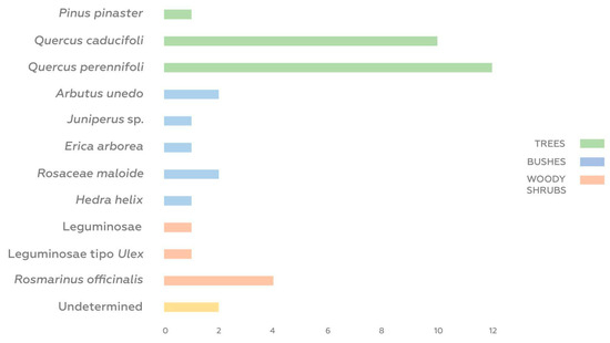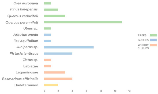 Protohistoric anthracological record: number of stratigraphic units in which different anthracological species have been recorded (Phase II). Data derived from Table A3 (Appendix A).