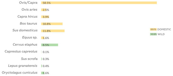 The majority of the remains identified, 89.1%, were from domestic animals compared to 10.9% from hunted animals. Caprinae dominate (caprinae + sheep + goats; 64.9%), while domestic suidae (11.8%) and cattle (10.8%), the second most represented species, had similarly low values. Lastly, equidae remains (1.6%) were negligible (Figure 8; Table A5). In turn, malacofauna remains were token and reduced to five fragments corresponding to marine bivalves.