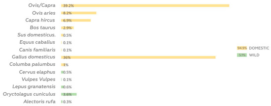 Sheep and goat bones and teeth were differentiated according to the criteria of Boessneck et al. [29], Payne [30], Halstead et al. [31], Zeder and Lapham [32] and Zeder and Pilaar [33]. However, the significant bulk of remains were included in the mixed category of caprinae (OC). When it was not possible to identify the remains at a species level due to the state of conservation, we quantified them osteologically by size, i.e., macro (cattle, horse) and meso-mammal (in which we grouped medium-sized animals, such as caprinae and suidae) categories. Small splinters with no osteological or taxonomic provenance were counted as unidentified remains. Unidentified avian remains were included in the general category of birds.