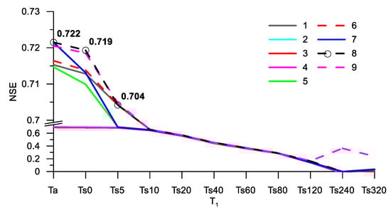 Nash–Sutcliffe efficiency (NSE) coefficient for nine models at various controlling temperatures, T1.