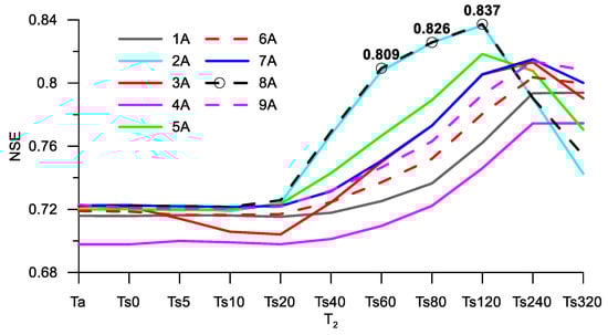 Nash–Sutcliffe efficiency (NSE) coefficient for nine models with modification A at various controlling temperatures, T2.