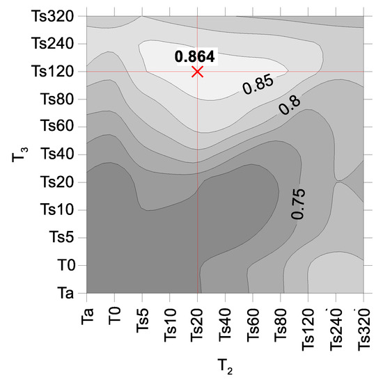 The first modification of the models (modification A) considers an explicit change in the temperature sensitivity coefficient, k, with a change in temperature T2 (Equation (1)). The variable controlling the temperature sensitivity coefficient was selected from the set of air, surface, and soil temperatures. Figure 2 shows the model suitability (NSE coefficient) for various temperature parameters, T2, controlling the changes in model parameter k. The model optimization results are provided in Table 4. The governing temperature resulting in the best model performance was always the deep-layer soil temperature.
