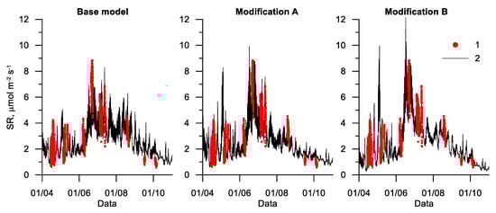 The shape of the seasonal course and magnitude of the diurnal variations in soil respiration varied between the base models and their modifications (Figure 4). The base models (Table 1) exhibited lower variations in the CO2 effluxes during the study period. Although the main factor controlling soil respiration was air temperature, the amplitude of the diurnal variations in model modifications A and B was controlled by the deep-layer soil temperature. The changes in the temperature sensitivity coefficient according to model modification A (Equation (1)), and subsequent changes in the base level of respiration due to model calibration, resulted in an increase in the diurnal variations of soil respiration in the middle of summer. The soil respiration values determined by model modification B (Equations (1) and (2)) were higher in May and June than those determined by the base model, but the frequency of the variations was lower.