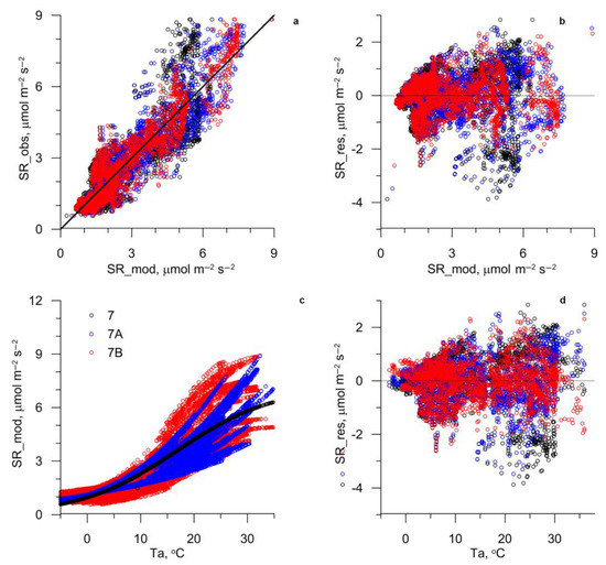 As shown in Figure 5c, the CO2 efflux obtained by the base logistic model (model 7) was functionally related to the air temperature. The soil respiration simulations according to model 7A exhibited a set of logistic-type curves describing the changes in soil respiration with air temperature at various soil temperatures. Model modification B caused spreading of a range of logistic-type curves, but their shape remained intact. The absence of a systematic error in the models is claimed by almost zero dependence of the model residuals, both from air temperature and soil respiration (Figure 5b,d). Similar relationships were observed for all investigated models (see Supplementary Materials).