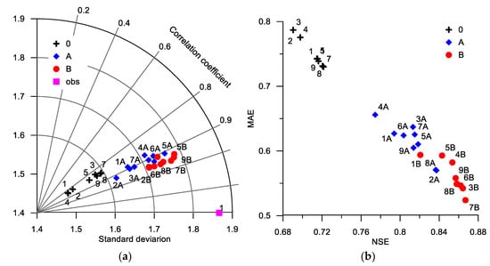 Taylor diagram (a) and model goodness characteristics (NSE) (b) for base (0) and modified (A,B) soil respiration models. Obs: observation data (STD = 1.87).