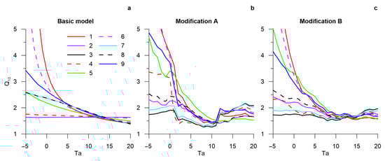 Relationships between the apparent temperature sensitivity, Q10, and air temperatures (Ta) for base models 1–9 and their modifications, A and B.