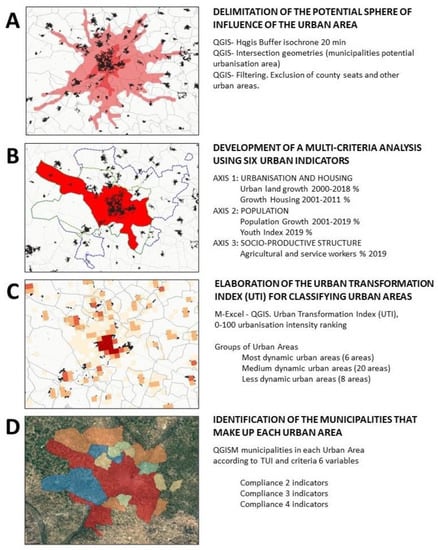A synthetic methodology is proposed, which uses multivariate analysis and GIS tools to define urban areas. The analysis criteria are based on the most recent demographic and urbanizing dynamics. It is approached from three different and complementary dimensions: the scope of suburbanization (definition of the urban area), the intensity (the unequal impact within the urban area) and the territorial gradation of the processes (differentiation of the most and least affected municipalities within the urban area). To resolve these issues, a synthetic indicator is generated from six variables grouped into three criteria. The following section presents the methodological proposal to address and respond to this problem and the results obtained from the application of the ITU to a group of medium-sized inland cities.