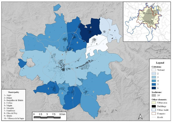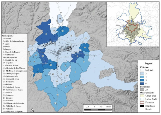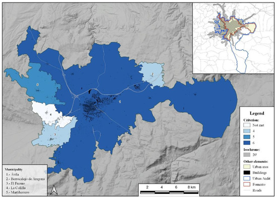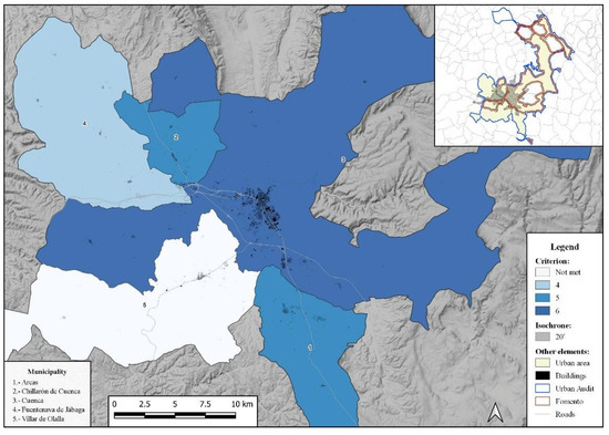 The use of the ITU makes it possible to assess the level of adjustment of the 20-min isochron to the sociodemographic and urbanizing dynamics of the peri-urban space located within this threshold. It helps to establish a delimitation that is more in line with the reality of urban areas in medium-sized cities, since the processes of territorial reconfiguration at this level of the urban hierarchy have their own idiosyncrasies. It also helps to assess the level of compliance with the hypotheses, which assign urban behaviors to municipalities located in the haloes of cities. When applying the criteria of the Urban Audit (UA) or of the Ministry of Public Works (MITMA), mismatches can be seen, either by excess or by defect. The UTI allows better adaptation of the territorial scope. On the other hand, with the classification of urban areas, the UTI allows the categorization of the behavior of municipalities within each urban area to be established. This is done by using the fulfillment of criteria for each of them. Due to space limitations, it is impossible to include the reality of all the cases. Six examples are presented—two corresponding to each of the three categories of urban areas (Figure 3, Figure 4 and Figure 5). They show the unequal degree of integration of each of the municipalities.