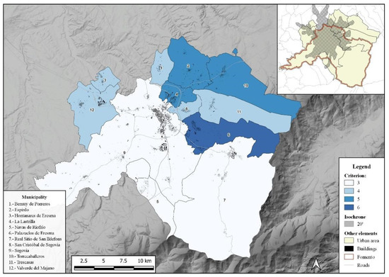 Under the framework of this state of the art, this work aims to focus on the processes of suburbanization of medium-sized cities in inland Spain to delimit their scope in the configuration of urban areas. It is intended to contribute to this debate and seeks to resolve some of the imbalances and deficiencies detected in the existing institutional proposals in the delimitation of urban areas. The fundamental reason is that these feature highly heterogeneous territorial scopes, which are especially critical when applying them to medium-sized cities. The hypothesis used is that the limit of urban areas for the inner average cities is marked by the 20-min isochrone. This is a threshold that combines accessibility, urbanizing dynamics and socioeconomic transformations, the latter especially intense in the first decade of the 21st century. This idea contrasts other criteria of functional delimitation, which more accurately reflect the reality of large urban areas, but which are questionable for their application to medium-sized cities. In the development of the research projects “Urbanisation dynamics and urban policies in inland medium-sized cities. From expansion and dispersion to reformulation: towards a more urban urban planning?” (CSO2015-63970-R) and “Spanish medium-sized cities: urbanisation and urban policies. 40 años de ayuntamientos democráti-cos:1979–2019” (RTI2018-096435-B-C21+C22), we studied the impact and intensity of urbanization pressure on municipalities around medium-sized cities in maximum radii of 30 km using GIS. The layers of urban land cover and increase in housing stock in the period 2000–2018 confirmed that the real estate and land pressure generally coincided with the time isochrone marked by the 20 min of motor vehicle travel time on the main roads and taking into account the hierarchy and capacity of the main roads according to the buffer calculation through Hqgis spatial analysis (GIS). The main results on the case studies of each of the cities that serve as the basis for the model can be found in Andres, Bellet and Cebrián [27].