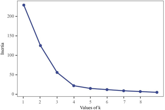To determine the optimal number of clusters, the elbow method was used to select the k value at the “elbow”, which is the point where inertia begins to decrease in a linear fashion (Figure 2). Therefore, the optimal number of clusters for the data was four.