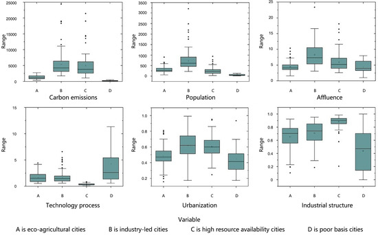 The regression results for the four categories of Chinese cities showed that population and the level of economic development have the greatest degrees of influence on urban emissions. Meanwhile, the level of urbanization and industrial structure have relatively small effects. In particular, the level of technology has a significant negative impact on carbon emissions, indicating a downward trend in carbon emissions as energy efficiency increases. This finding confirms that technological progress is the main driver of the decline in carbon emissions. The level of urbanization and industrial structure have different influencing factors for each type of city, with positive or negative effects, depending on the characteristics of the city category. The characteristics of the different types of cities are detailed in Figure 4.
