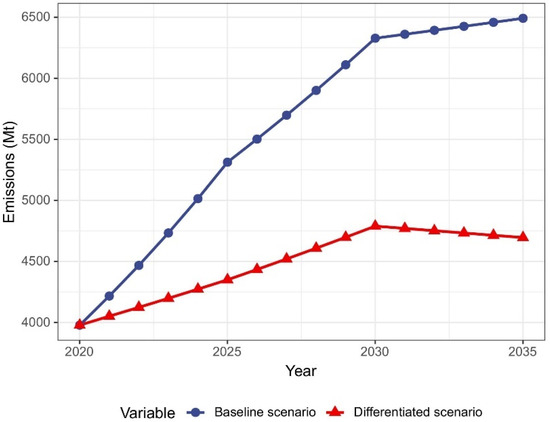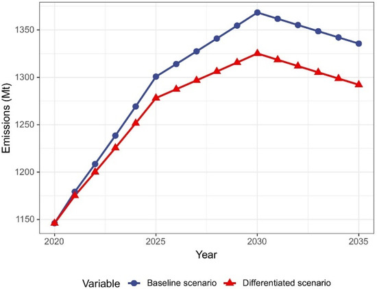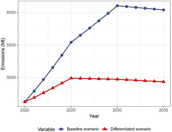 Taken together (Figure 9), the baseline scenario shows continued growth in total city-wide carbon emissions, increasing at a lower rate after 2030 but failing to meet the carbon peaking target. In the differentiated scenario, by controlling different elements for the different types of cities, the cities as a whole reach peak carbon emissions in 2030 and achieve a 20.83% reduction in carbon emissions compared to the baseline scenario over the same period. It is possible to reach the 2030 carbon peak target on time based on the differentiated development of the various cities. The carbon intensity in 2025 under the differentiated scenario would be 18.81% lower than in 2020, which would achieve the 18% target in China’s 14th Five-Year Development Plan, and, when carbon peaks in 2030, 31.27% lower than in 2020.