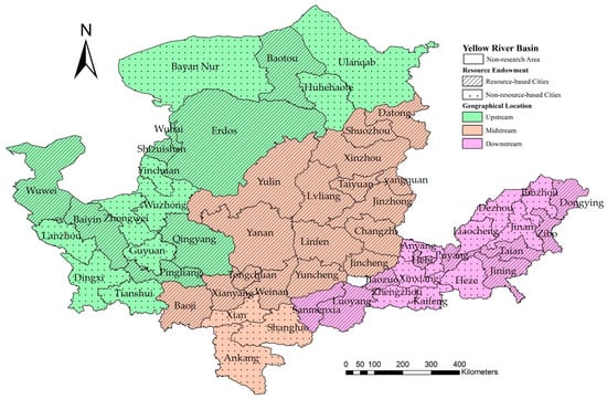 The Comprehensive Plan for the YRB (2012–2030) divides cities in the YRB into upstream, midstream, and downstream cities based on their geographical locations. The YRB is an energy basin in China with rich resources including coal, oil, natural gas, and minerals []. The upstream area has several hydroelectric power stations that have been built due to the high terrain, many canyons, and rapid water flow. The midstream region is located in the Loess Plateau area and has rich coal resources; most resource-based cities with coal mining are located here, such as Yulin, Ordos, and Jincheng. In the downstream area, the terrain is gentler, mostly plains and hills, with rich natural gas and oil resources. Therefore, most of the cities in the downstream area are mainly engaged in oil and gas extraction, such as Puyang and Dongying, etc. In December 2013, the State Council officially released the National Sustainable Development Plan for Resource-Based Cities (2013–2020), which identified 262 resource-based cities. According to the content of this plan, there are 37 resource-based cities in the YRB, accounting for 25.4% of the total number of resource-based cities in China []. Resource-based cities are the types of cities that have emerged or developed from the exploitation and processing of natural resources, such as local minerals and forests that are used for leading industries []. As an important energy and resource supply base, resource-based cities have made important contributions to the industrialization process of the YRB []. However, due to the long-term uncontrolled exploitation of natural resources, a large number of resource-based cities are gradually evolving into resource-depleted cities, and the resulting unreasonable land use structure and low land use efficiency have become the main bottlenecks limiting the economic development of the YRB. Therefore, in this study, we divide the cities in the YRB into upstream, midstream, and downstream cities according to differences in their geographical locations. In addition, based on differences in resource endowments, the cities can be divided into resource-based cities and non-resource-based cities. A sample of cities in the YRB, in this study, is shown in Figure 1.