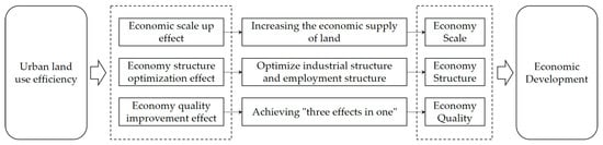 Urban land use carries both the economic benefit and social benefit of economic and social development and improvement of people’s lives, and the environmental benefit of ecological environment protection []. Currently, rough land use leads to serious waste of land resources, and also causes incalculable ecological losses and seriously restricts the improvement of economic quality []. Improving ULUE will release the utilization potential of stock, idle, and inefficient land, and then, improve the intensity of land development and utilization, and therefore, promote economical and intensive use of land []. Rationalization of land development and utilization intensity inevitably corresponds to higher economic, social, and environmental benefits. At the same time, the economical and intensive use of land inevitably promotes industries to reduce ecological and environmental costs through the conversion of old and new dynamics. Therefore, the improvement of ULUE is bound to promote the realization of “three benefits” and ultimately improve economic quality.