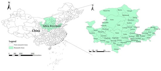 The YRB lies between latitudes 32° and 42° north and longitudes 96° and 119° east, with a width of about 1900 km from east to west and a length of about 1100 km from north to south. According to the “YRB Comprehensive Plan (2012–2030)”, the YRB flows from west to east through nine provinces and regions, including Qinghai, Sichuan, Gansu, Ningxia, Inner Mongolia, Shaanxi, Shanxi, Henan, and Shandong, with a basin area of 795,000 km2 (including 42,000 km2 of inland flow area). According to the 1995 administrative division statistics, the YRB involves a total of 69 regions (states, cities, and leagues). Considering data availability and completeness, 56 cities in the YRB were finally selected as the study units, as shown in Figure 3. According to the relevant data, the total population of the YRB is 421,801,500, which accounts for 30.05% of the total population of the country, and the GDP is CNY 247,407.66 billion, which accounts for 25.11% of the national GDP. With a land area of 27.3% of the country, the YRB supports 1/3 of the population and contributes 1/4 of the total economic output.