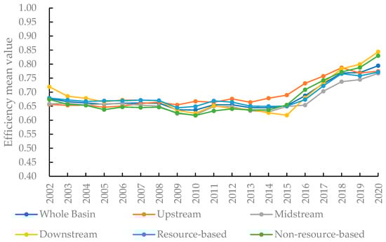 The super-efficiency SBM-undesirable model was used to measure the ULUE in the YRB during the study period by constructing an input-output index system (Figure 4). The mean values of ULUE in the YRB fluctuate and increase from 0.677 (in 2002) to 0.794 (in 2020), and the mean value of ULUE shows a significant change with the year 2013 as the boundary. The mean values of ULUE increased rapidly from 0.645 (in 2013) to 0.794 (in 2020) due to the release of the “Comprehensive Plan for the YRB (2012–2030)”, which has played important roles in promoting the economical and intensive use of land in the YRB and the in-depth promotion of ecological civilization construction. Downstream cities have the highest land use efficiency, followed by upstream cities; the land use efficiency of midstream cities is relatively low. The land use efficiency of resource-based cities is higher than that of non-resource-based cities before 2015, while non-resource-based cities have higher land use efficiency after 2015.