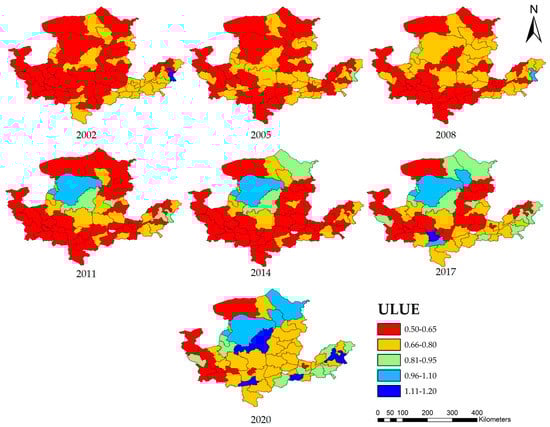 Spatial distribution pattern of ULUE in the YRB from 2002 to 2020.