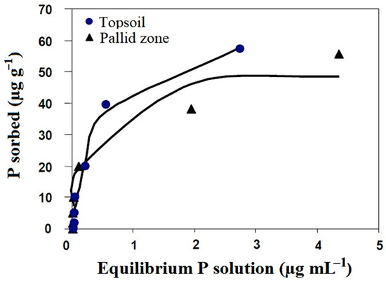The Langmuir P maximum (Xm) values were 67.55 and 40.21 μg P g−1 in the topsoil and the pallid zone, respectively, classifying them in the low-to-moderate P sorption soils of Southwestern Australia. The P adsorption lines for the two soils (Figure 2) illustrate that the soils are slightly different in P-buffering capacity, with topsoil showing higher P-buffering capacity compared with the pallid zone (Table 3).