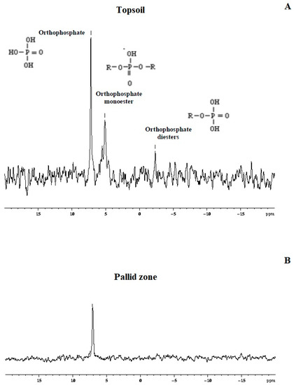 A solution 31P-NMR analysis of 0.5 M NaOH–0.1 M EDTA extracts identified structural forms of inorganic and organic P. The abundance of all the P groups was determined using 31P-NMR. Orthophosphate was higher for the topsoil compared with the pallid zone. Monoester P and diester P were also detected only in the topsoil (Figure 3).
