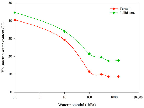 The matric potential reflects the particle size distribution of the samples, with the finer-textured soils holding a greater volume of water at each measurement potential. The difference between the −1500 kPa and the −10 kPa water contents is generally recognised as the amount of plant-available water; however, this is based on evidence from agricultural systems. Since soil matric potential indicates how much energy plants will have to exert to extract water molecules from soil particles, it can be different between native and crop plants. Native plant species are typically able to extract water from soils with much greater matric potentials [84]. The topsoil seems to show a good capacity to hold and release water to plants over a wider range of matric potential, enhancing its suitability as a plant growth substrate in restoration schemes. This is important since even native drought-tolerant plant species should be provided with enough water at the early stages of growth in restoration sites. It should be noted that soil water retention curves will vary with bulk density. Soils with higher bulk density cannot hold a large amount of water and have a lower amount of total available water, which is the difference between soil water content at field capacity and the permanent wilting point.