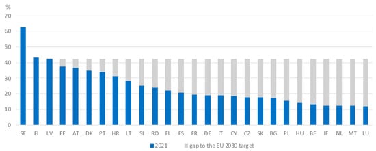 Energy efficiency measures in buildings aim to decrease final energy consumption but, obviously, do not reduce it to zero; therefore, to further lower greenhouse gas emissions, it is necessary to accelerate energy transition locally and globally through the use of renewable energy sources (RESs). According to Eurostat data [22], the share of energy from renewable sources in EU countries has been gradually growing from an average of 9.6% in 2004 to 21.8% in 2021 (Figure 2), but it must increase significantly in the years ahead to meet the new mandatory RES target of 42.5% by 2030 set in the 2023 revision of Directive 2018/2001/EU [23,24].