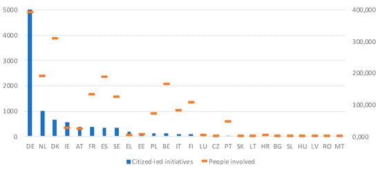Citizen-led energy initiatives (left axis) and corresponding people involved (right axis) per EU countries (year 2000–2021) (source: our elaboration on Schwanitz et al., 2023 [29]).
