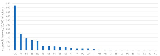 People involved in citizen-led energy initiatives per 10,000 inhabitants in EU countries (year 200–2021) (source: our elaboration on Eurostat and Schwanitz et al., 2023 [29]).