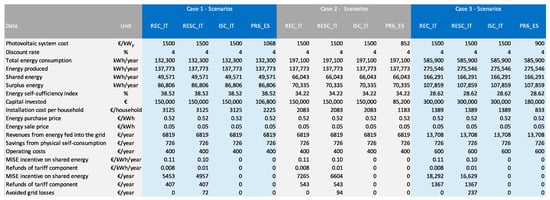 It is worth noting that the three case studies always fail to meet economic feasibility without incentives; in fact, the NPVs of scenario ISC_IT are always negative and equal to -8721 EUR (case studies 1 and 2) or -24.143 EUR (case study 3), while the PBPs are always greater than 20 years. These results are indicative of the fact that such financial instruments are necessary to implement the energy transition in the current technical and economic conditions and to obtain the active involvement of citizens, as well as to increase the energy autonomy of cities.