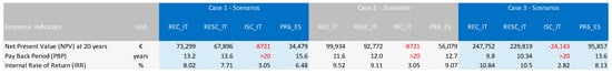 The resulting economic indicators NPV, IRR and PBP in Figure 7 were calculated by applying the formulas (1), (2) and (3) and using the RECON software (by ENEA) [67].