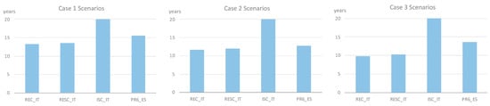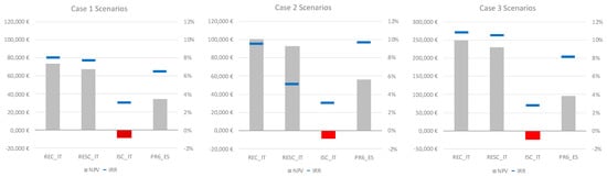 The comparison of the economic indicators of the case studies (Figure 8 and Figure 9) shows that the scenarios REC_IT and RESC_IT, corresponding to the two types of Italian energy communities, have the best economic performance in all the case studies. Given the same scenario, the change in NPV in the three case studies —for example from 73,999 to 247,752 EUR in case studies 1 and 3 respectively— depends on the higher cost efficiency and size of the PV system relative to the number of households involved and energy consumption. In contrast, given the same case study, the higher NPV value of the REC_IT scenarios depends on the feed-in tariff and tax deduction, which are higher than those of the other scenarios. Similar results are found for the indicators IRRs and PBPs. On the other hand, the NPVs of the scenario PR6_ES are also positive, although they are much lower than those of the scenario REC_IT, depending on the different type and size of financial instruments available in Spain.