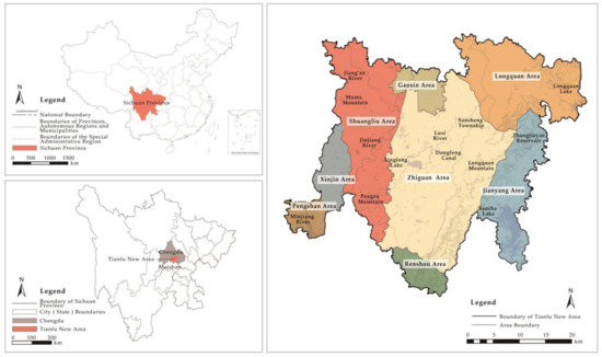 Chengdu city, the capital of Sichuan province, is a strategic economic hub in southwest China. Tianfu New Area is a national-level urban newly developed area of the city. Tianfu New Area is located on the southern edge of Chengdu Plain (Figure 1) and is located in the ecological protection area at the upper reaches of the Yangtze River. Its geographical location is between 30°13′38″ and 30°40′23″ N latitude and 103°47′59″ and 104°15′34″ E longitude [38]. Tianfu New Area includes the Gaoxin Area, Shuangliu Area, Xinjin Area, Zhiguan Area, Longquan Area, and Jianyang Area within the jurisdiction of Chengdu city, Pengshan Area, and Renshou Area of Meishan city. Its total planning area is 1578 km2 [38].