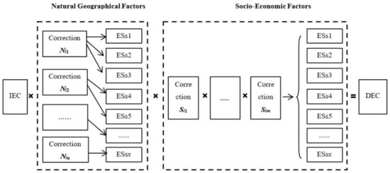 The adjustment framework of the space–time correction model [18]. IEC—the initial equivalent coefficients proposed by Gaodi Xie [12]; DEC—dynamic equivalent coefficients after natural geographical and socio-economic correction.