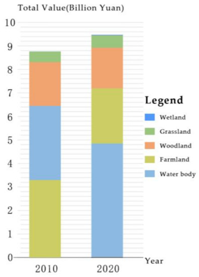 In this study, the total ESV of all land use types as well as all ESs types in Tianfu New Area in 2010 and 2020 were calculated according to Equation (13) (Table 3 and Table 4, Figure 4 and Figure 5).