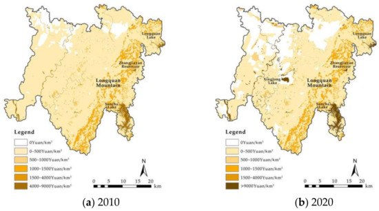 Spatial distribution of ESV per unit area of Tianfu New Area in 2010 and 2020.